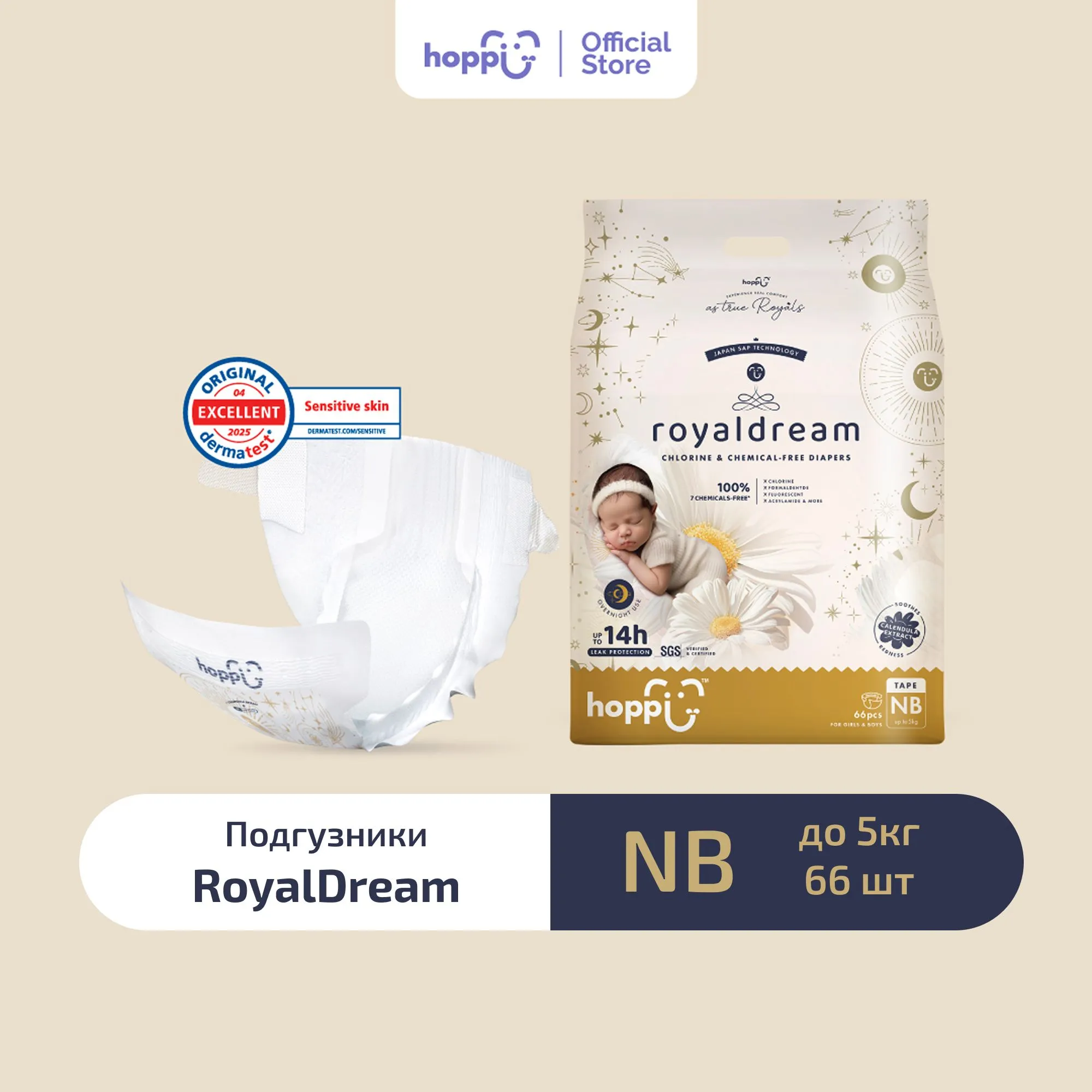 Hoppi RoyalDream — премиальные подгузники для новорождённых, созданные для максимального комфорта и спокойного сна малыша. Ультратонкие и невероятно мягкие материалы дарят ощущение «облачной» нежности, а продвинутая технология впитывания обеспечивает длительную сухость и защиту.